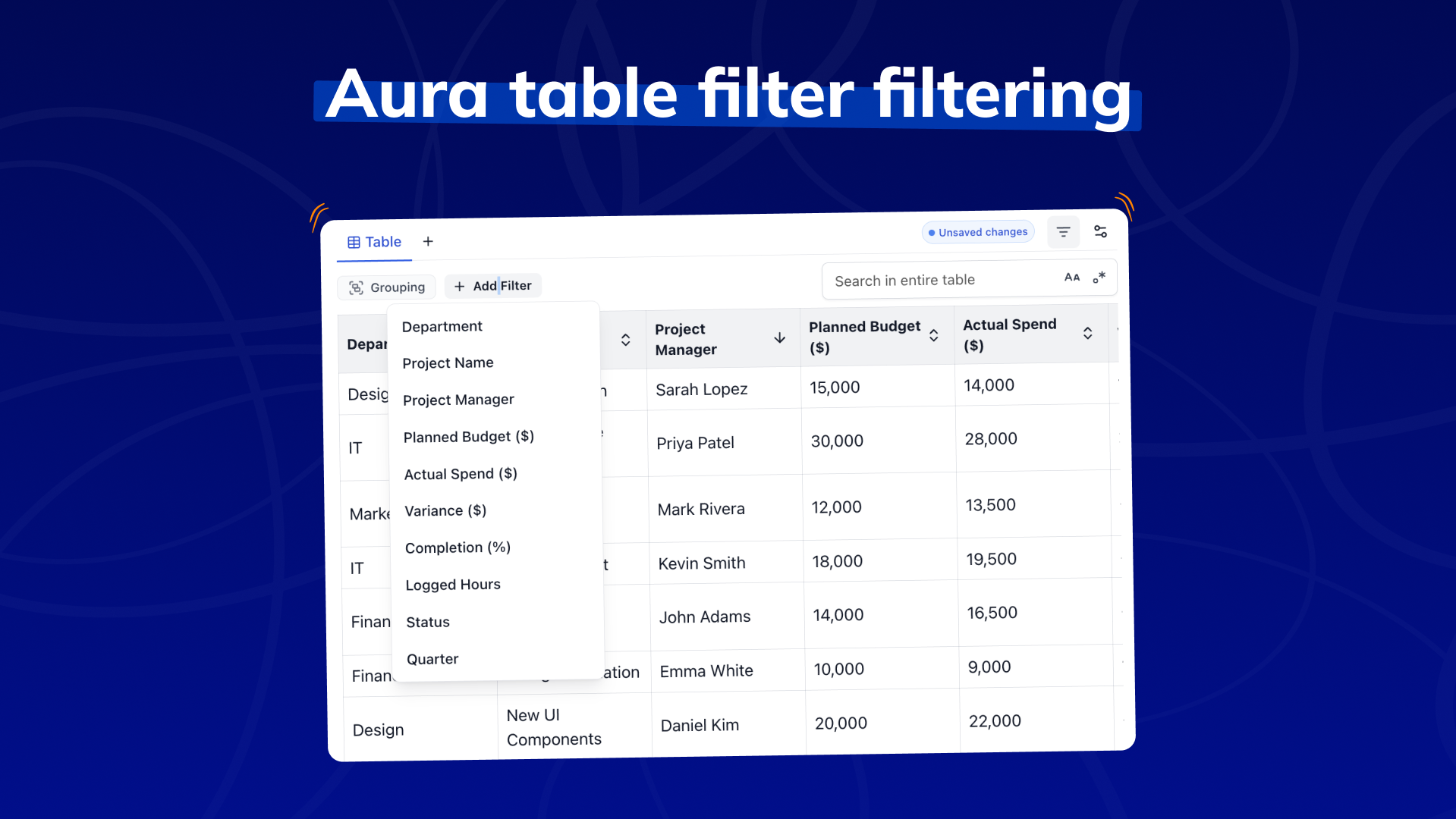 Aura table filter filtering | Creativas