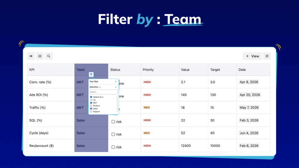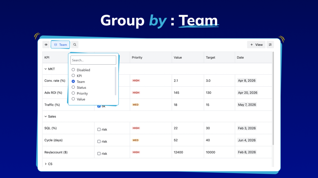 As KPI data grows, a long flat list of metrics becomes impossible to scan for different teams, statuses, and priorities all mixed together with no visual hierarchy. Grouping solves this by organizing data into meaningful categories on the fly. Group by team to see how each department is performing at a glance. Group by status to instantly separate what’s on track from what’s at risk. The data doesn’t change just how you navigate it.