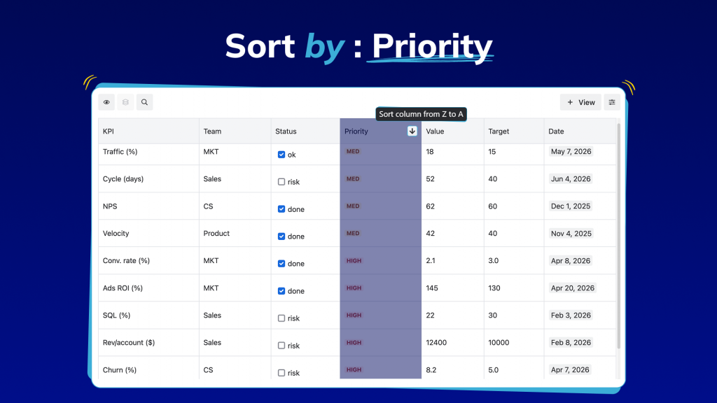 Without sorting, the answers to the most critical questions, which KPIs are underperforming, which campaigns are delivering, and what needs immediate attention, are buried inside the data. Sorting brings them to the surface instantly. Sort by lowest performance to identify risks before they escalate. Sort by highest impact to highlight wins worth sharing. Sort by deadline to stay ahead of what’s coming. Any field, any direction, actionable in seconds.