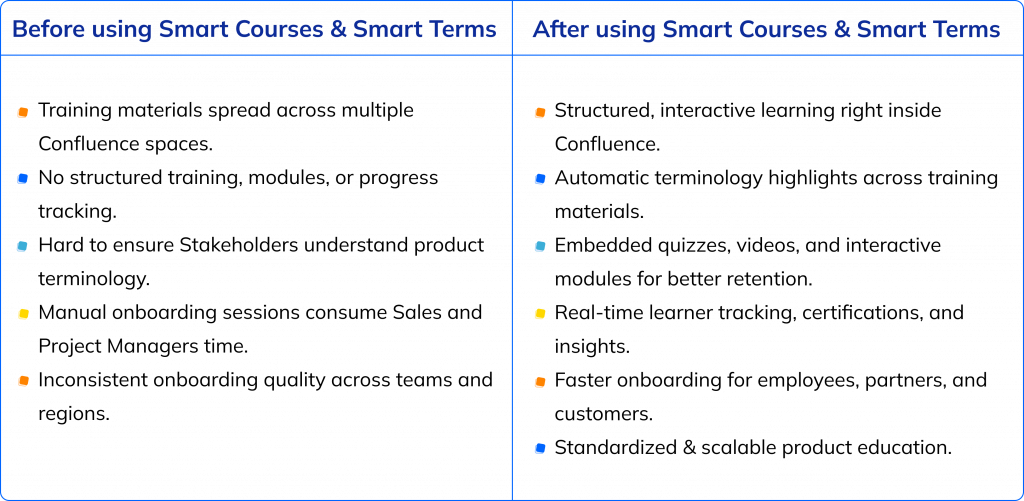 Smart Terms ensures consistent terminology across all training materials by automatically highlighting and defining product terms inline, reducing misunderstandings and accelerating learning. Because Smart Courses and Smart Terms work directly inside Confluence, you never need to duplicate content or rely on external tools; your existing product guides and release notes become part of a structured onboarding experience.