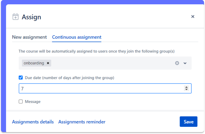 Well, this feature can save your time. The โcontinuous assignmentโ in Smart Courses. Simply add the Confluence group name, and let the magic unfold. Every time a new joiner becomes part of that group, the designated course will be automatically assigned to them.