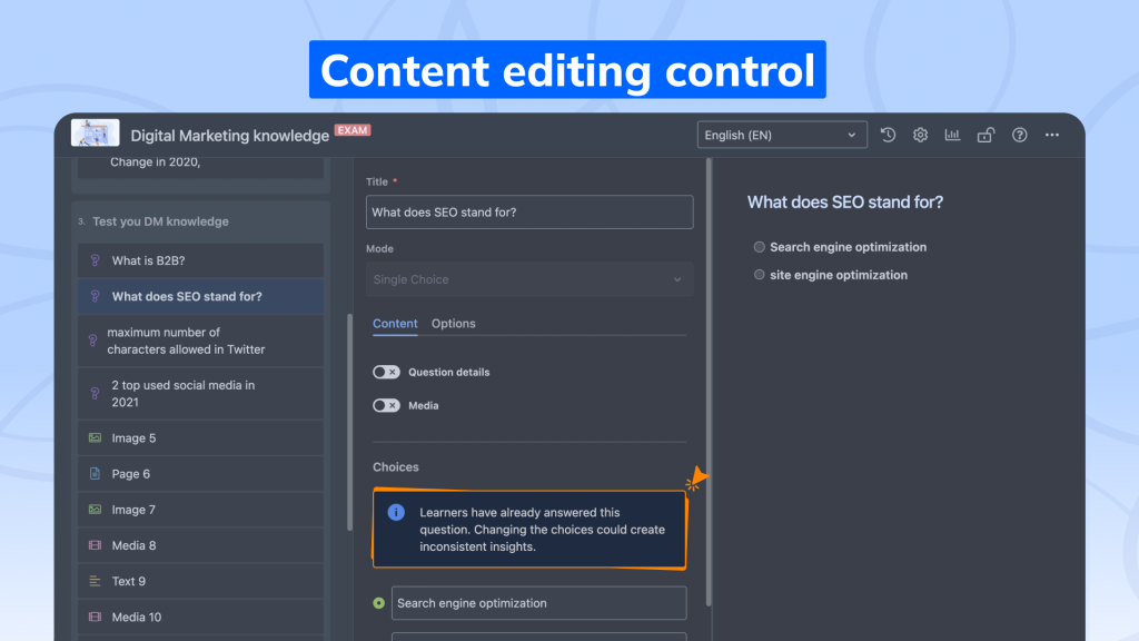 - Quiz integrity: When editing quiz questions that already have learner responses, changing the answer choices may impact existing data.