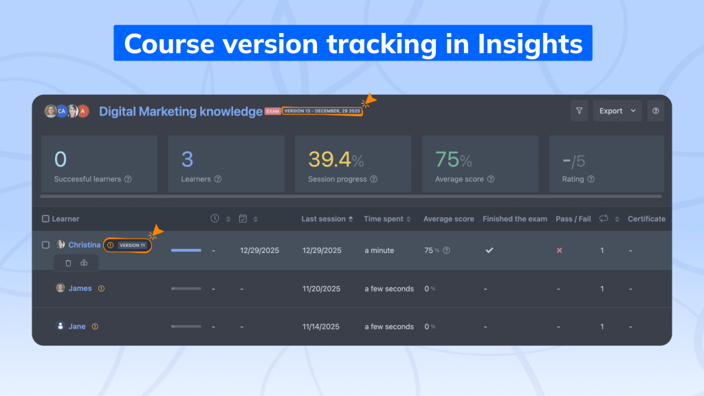 We’ve enhanced the Course Insights section to make tracking learner data clearer and version-specific.