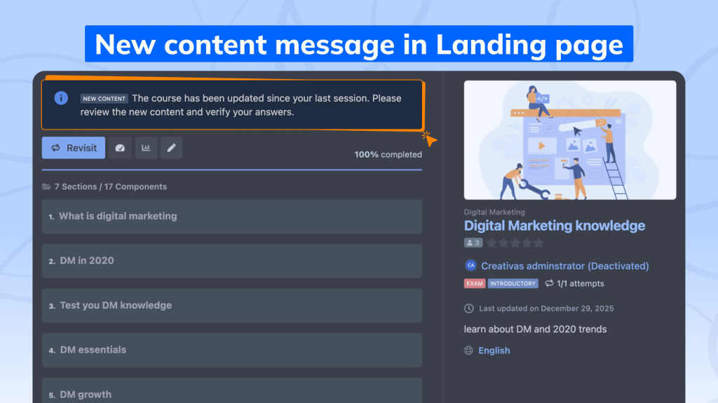 When a major update is published, the course card and landing page display a “New Content” tag to notify learners.