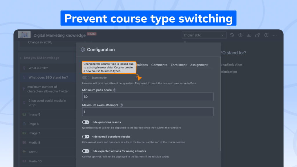 - Course type locked: You can’t switch between “exam” and “regular” course types after learner sessions exist. This ensures consistent reporting in Insights.